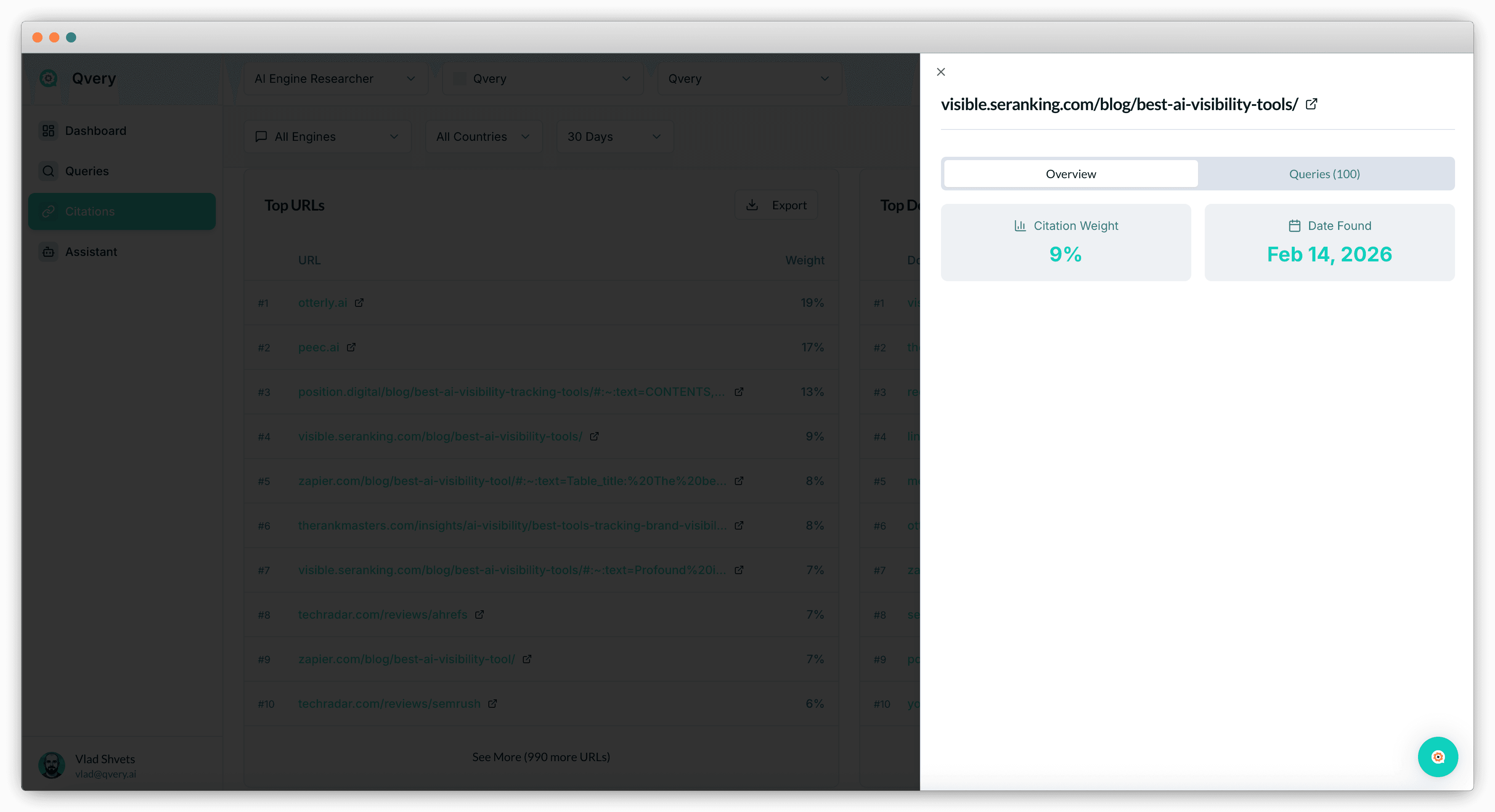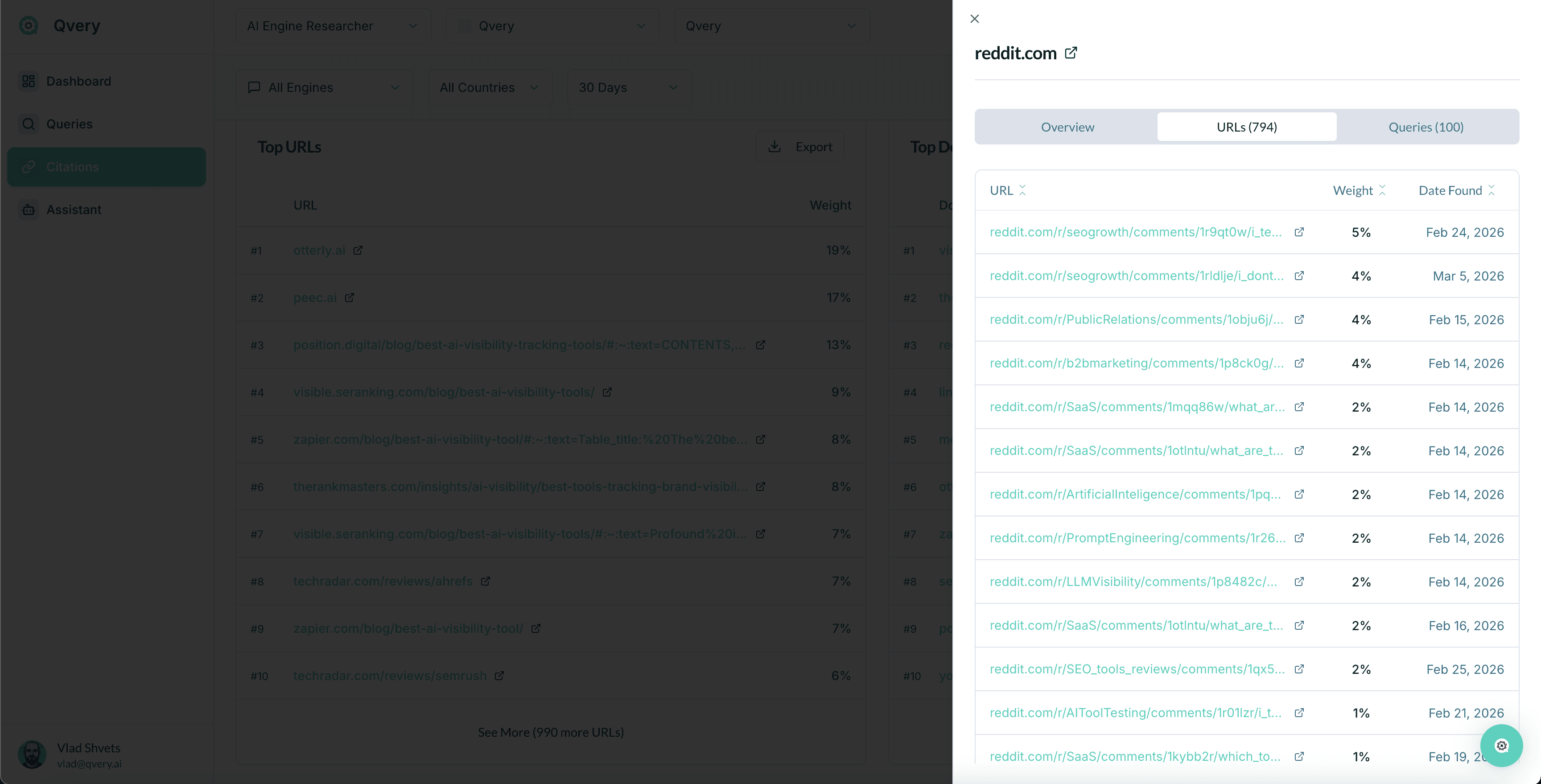 In Qvery's Citations module, you can see every external domain that AI engines cite when they discuss your space. Filter out your own domain and UGC sources. What's left is your third-party mention landscape.