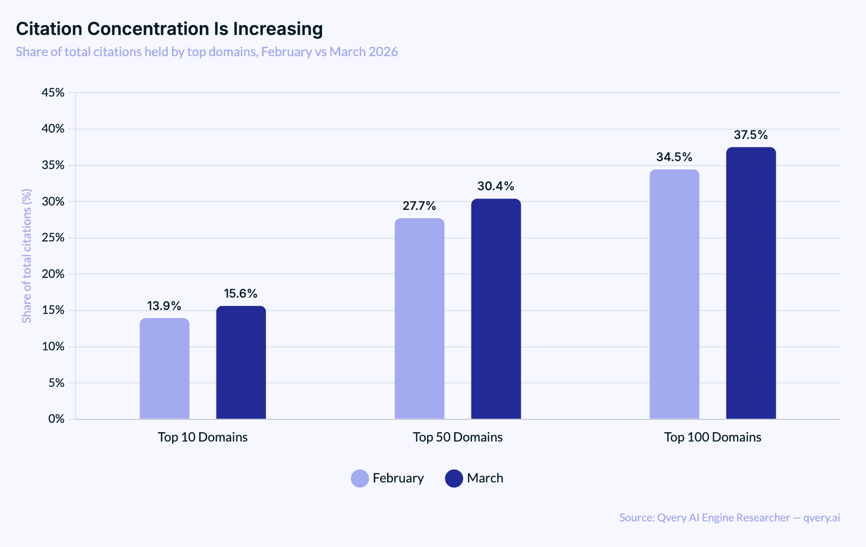 Top 10 domains: 13.94% of all citations in February → 15.63% in March (+1.7 percentage points)