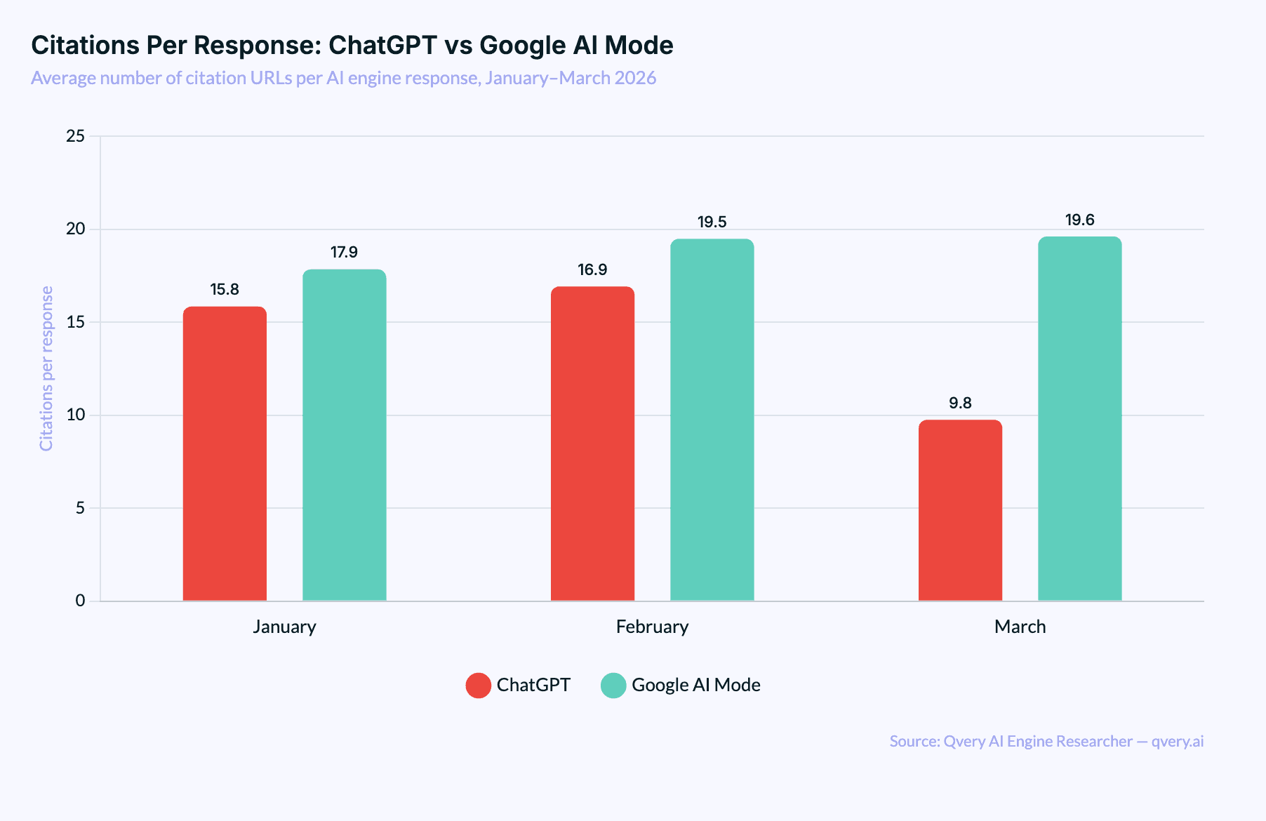 ChatGPT averaged 16.93 citations per response in February. In March, that number dropped to 9.76. Meanwhile, Google AI Mode went from 19.49 to 19.62, barely moving at all. For the first time in Qvery's tracking history, Google AI Mode now produces more citations per response than ChatGPT.
