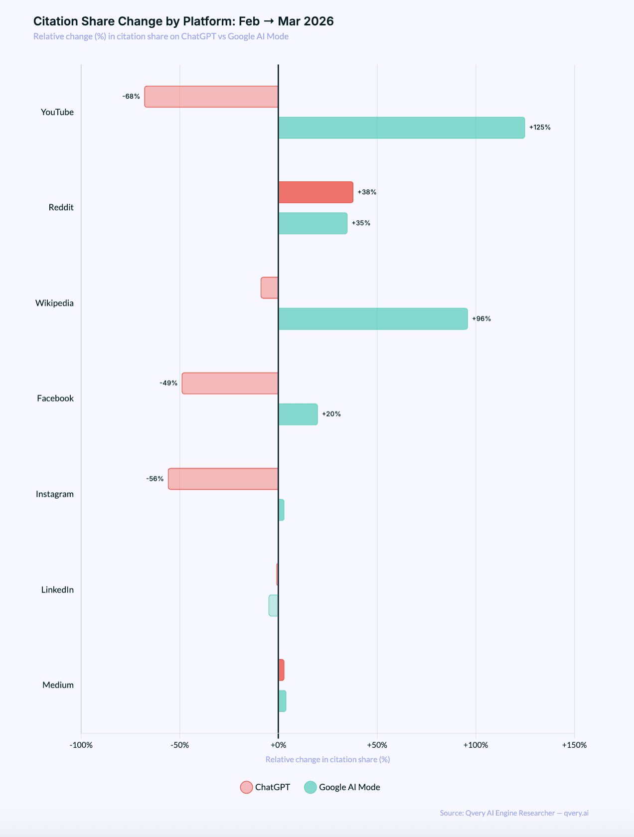 YouTube on ChatGPT: 0.45% → 0.15% (-68%). On Google AI: 1.01% → 2.27% (+125%).