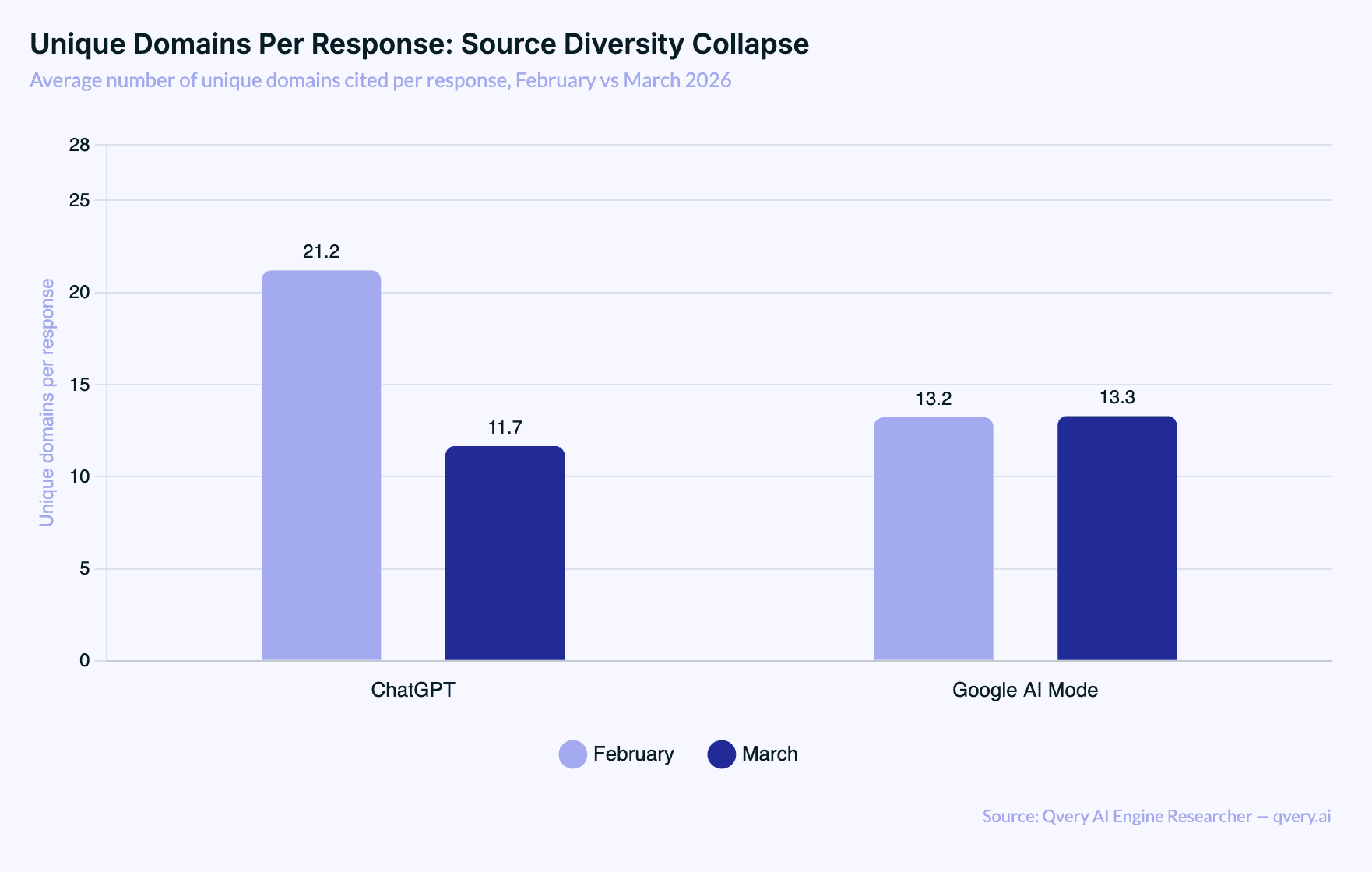 In February, the average ChatGPT response pulled from 21.2 unique domains. In March, that dropped to 11.7. The median went from 20 to 10. Google AI Mode, by contrast, was completely unchanged: average 13.2 in February, 13.3 in March. Median held steady at 12.