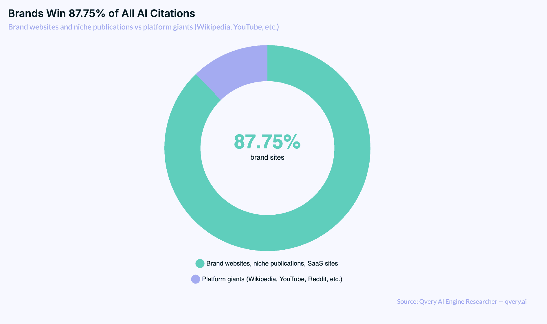 87.75% of all citations go to brand websites, niche publications, and SaaS sites — not platform giants like Wikipedia or YouTube. The brands themselves.