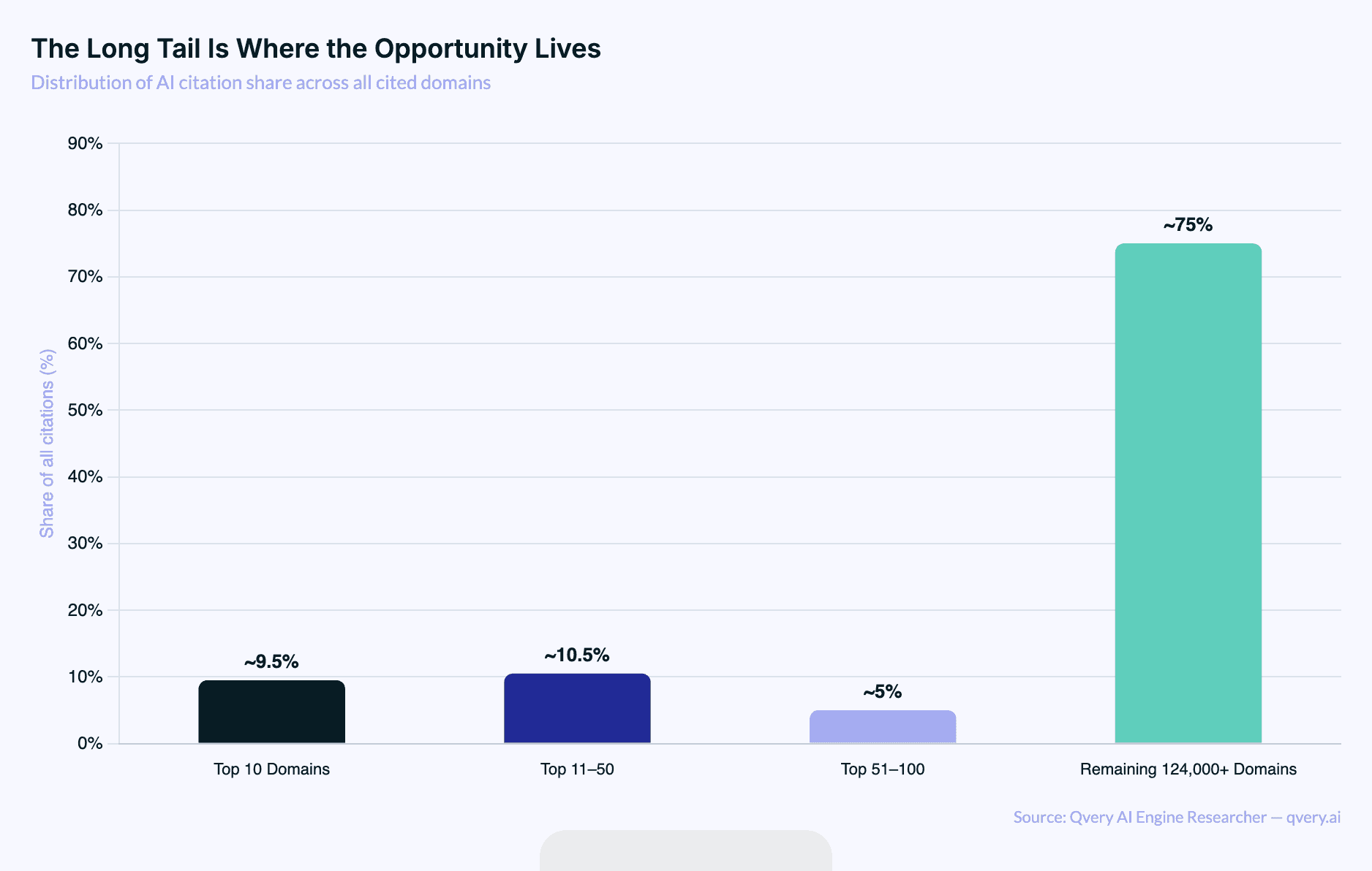 The top 50 most-cited domains account for roughly 20% of all citations. The remaining vast majority of domains share the other 80%. No single domain exceeds 3.3% of total citations. The top 10 universal domains together account for only about 9.5%.