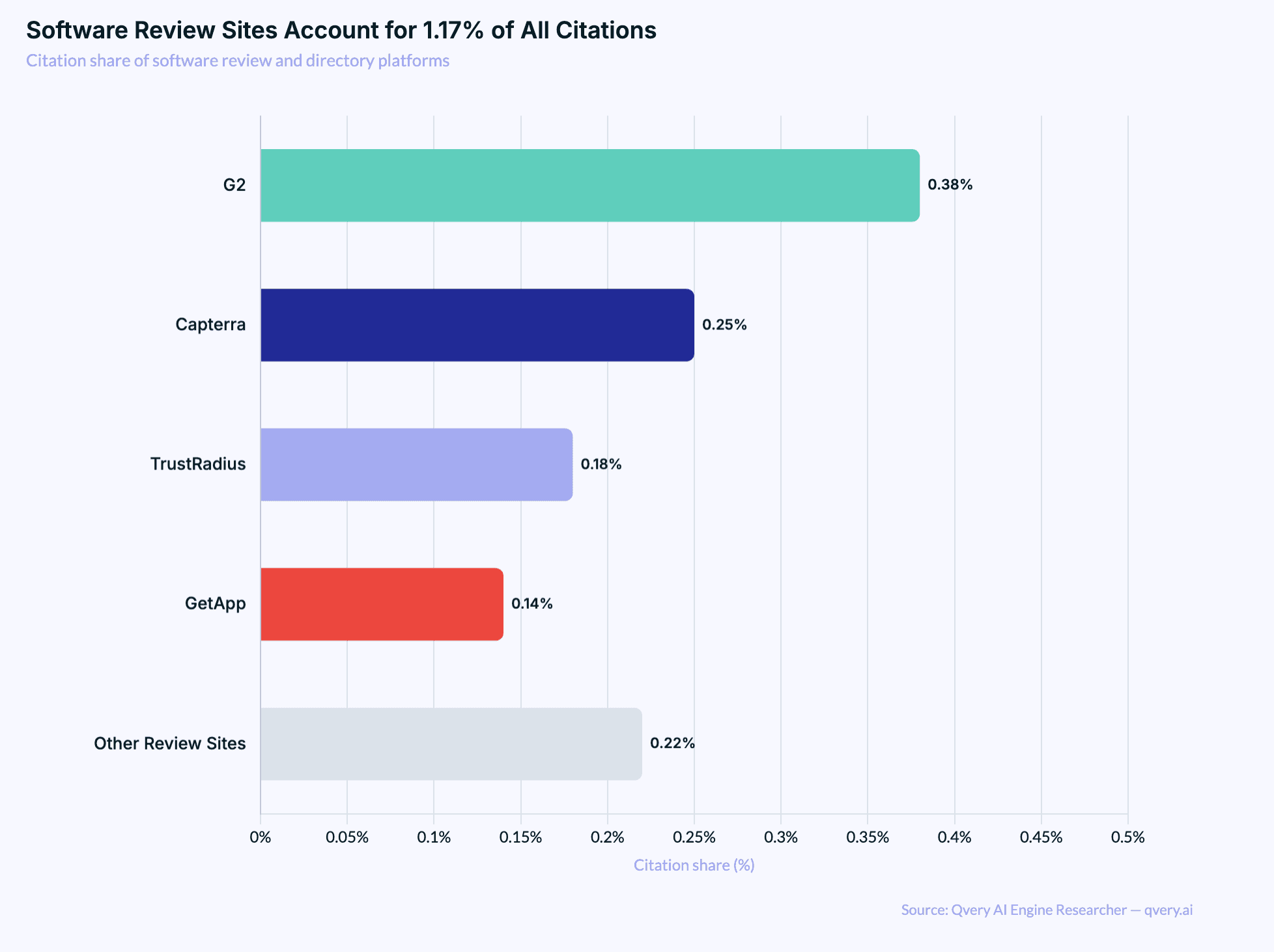 In our data, software review sites collectively account for 1.17% of all citations, with G2 leading.