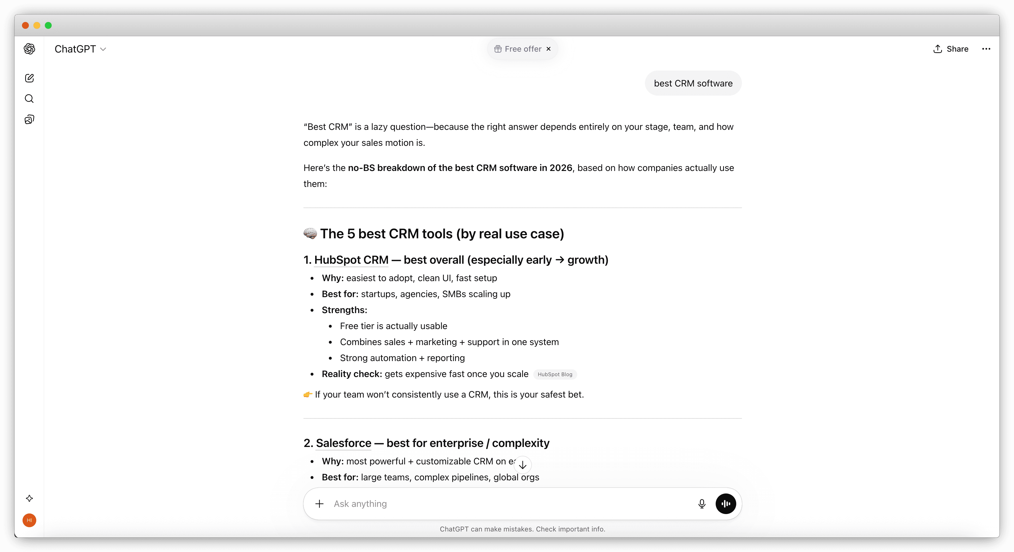 ChatGPT: You ask "what CRM should I use for a 20-person outbound sales team?" It breaks that into sub-queries, reads passages from dozens of different sources, and gives you a direct recommendation. You never click a link.