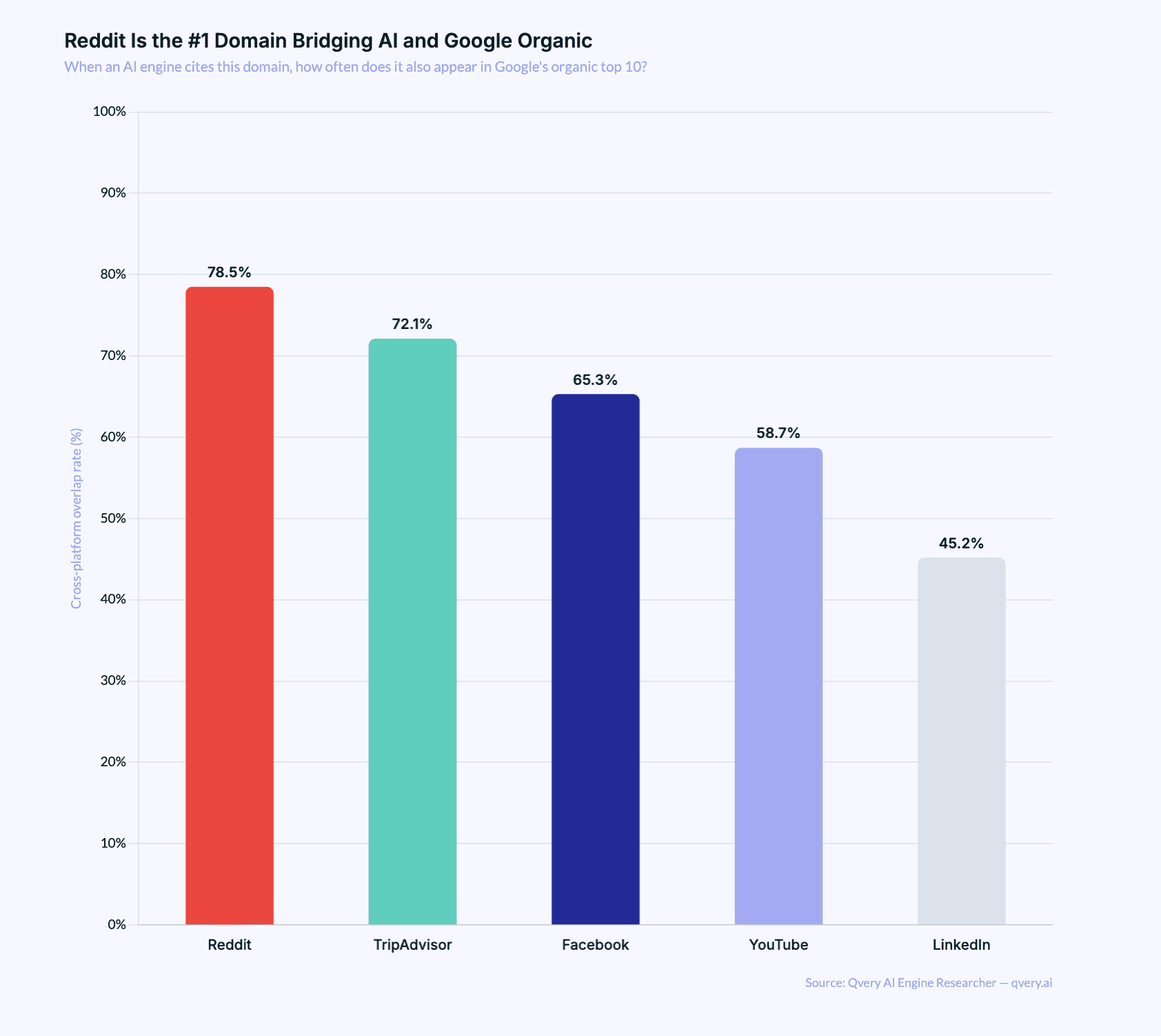 Reddit is the single most valuable domain for dual AI + organic visibility.