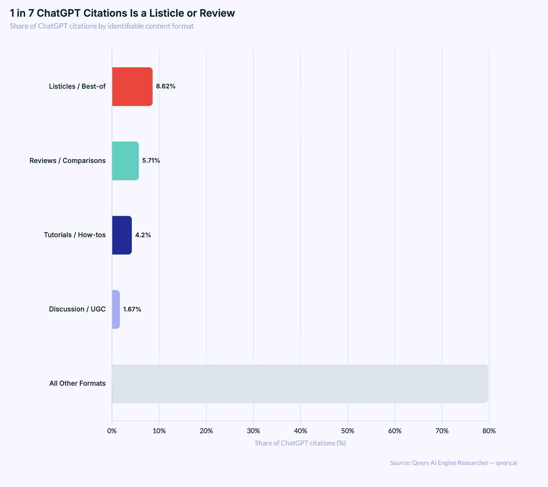 Combined, nearly 1 in 7 ChatGPT citations is a listicle or review.