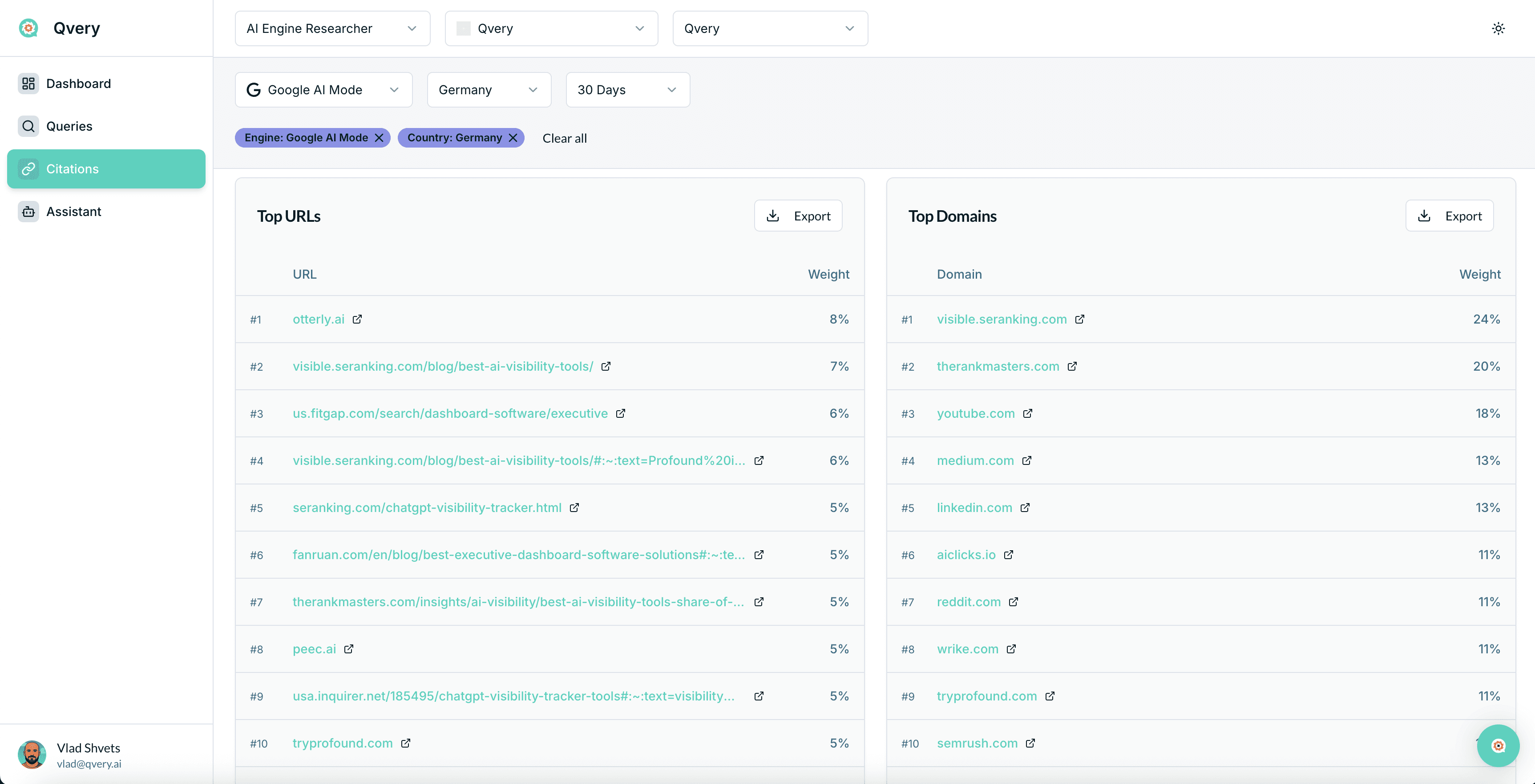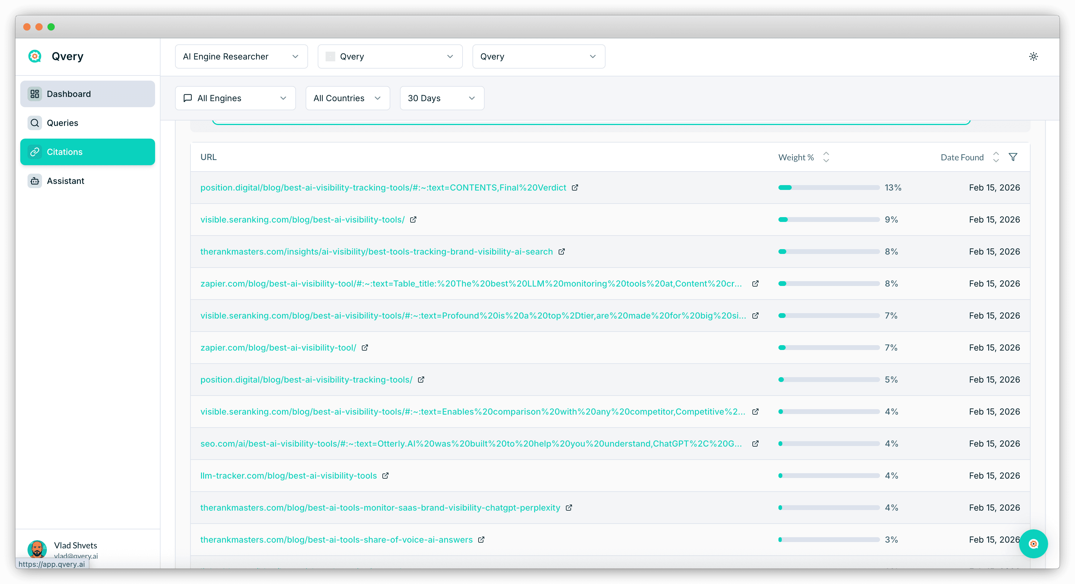 Qvery shows you the top-cited URLs in your space, ranked by citation weight. If a competitor listicle has a citation weight of 21% and your brand isn't there, that's your highest-priority outreach target.