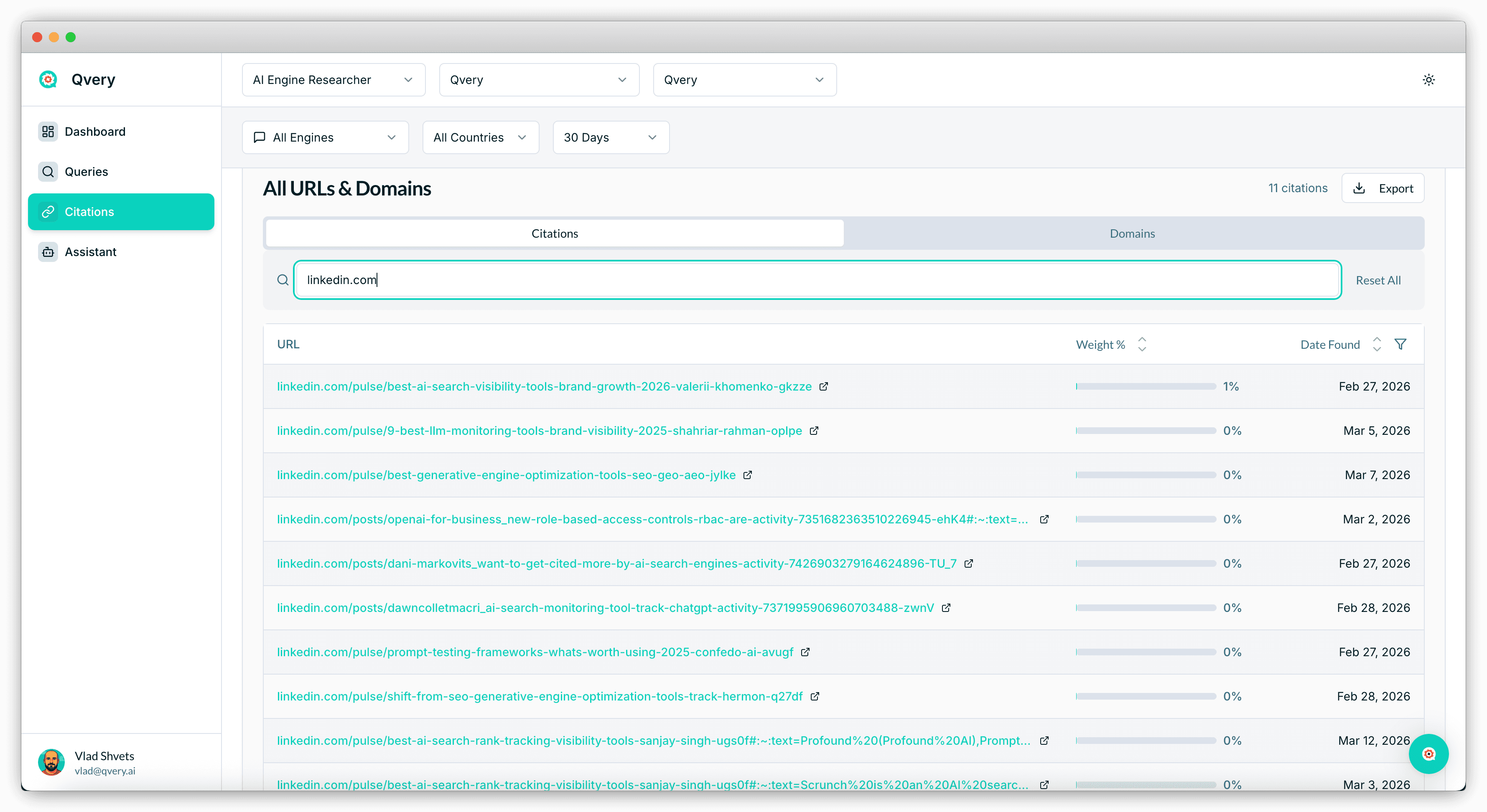 Every number in this post comes from Qvery's AI Engine Researcher. It tracks your brand's AI visibility daily across ChatGPT and Google AI Mode, capturing every citation, its source domain, and monthly trend.