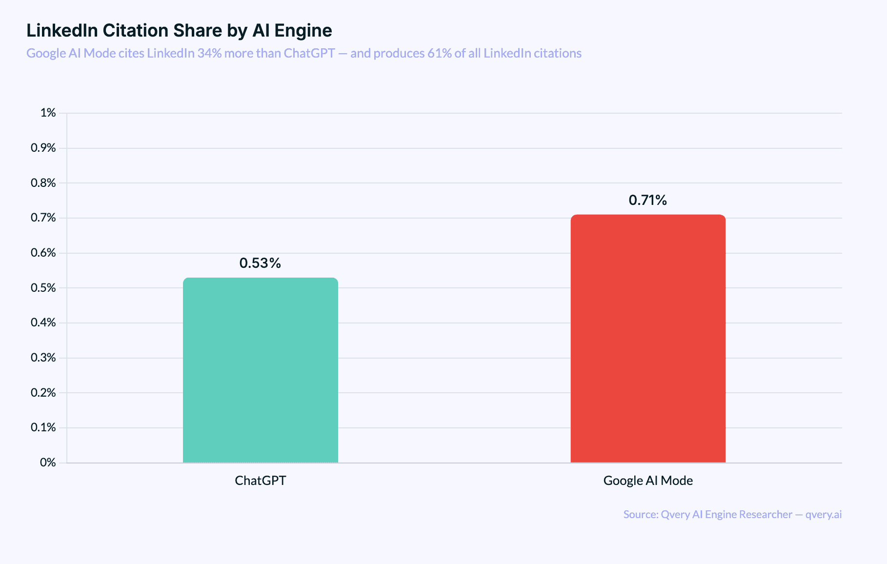 Google AI Mode cites LinkedIn 34% more than ChatGPT. LinkedIn accounts for 0.71% of Google AI's citations versus 0.53% of ChatGPT's. Google AI produces 61% of all LinkedIn citations.