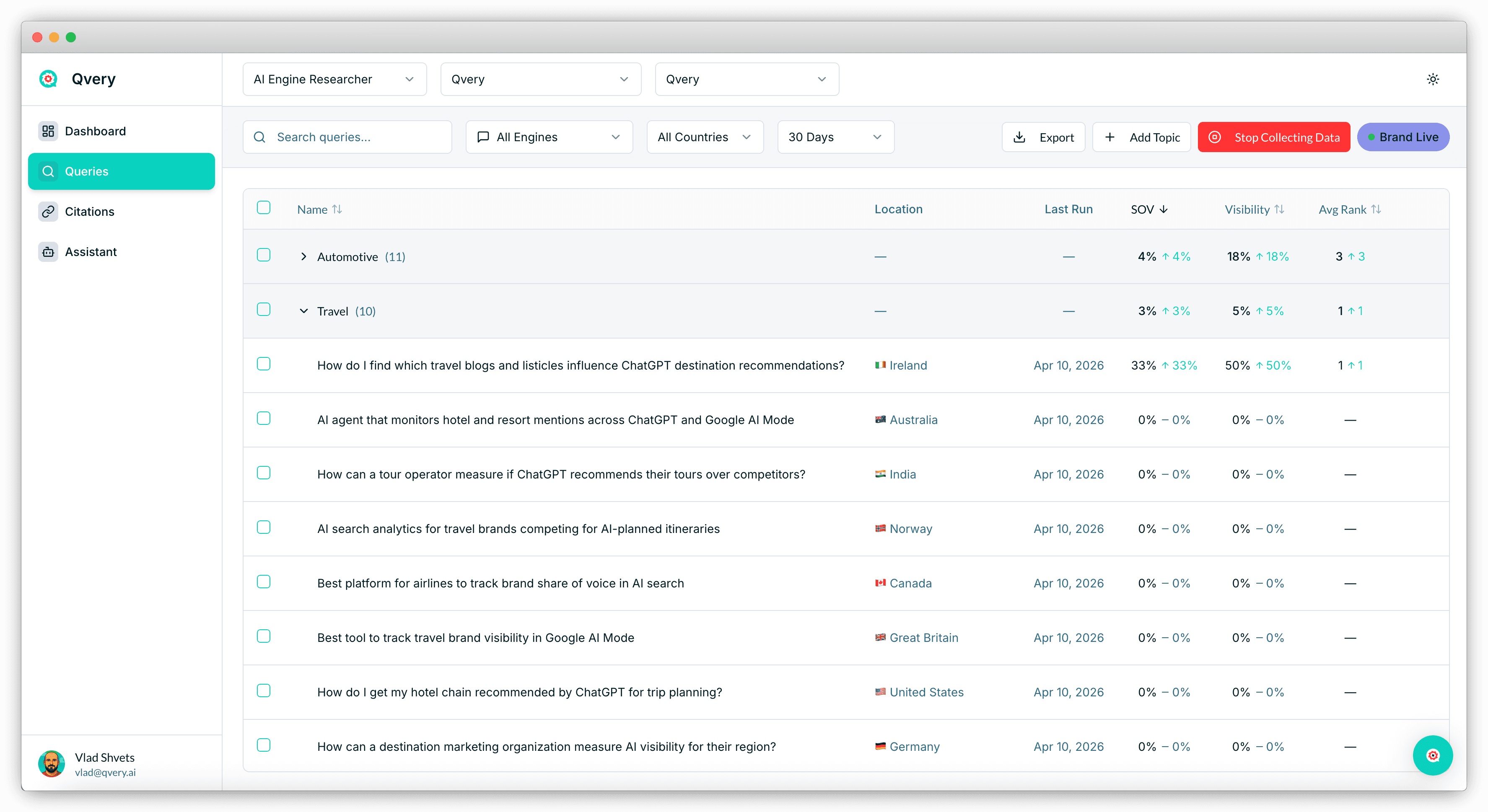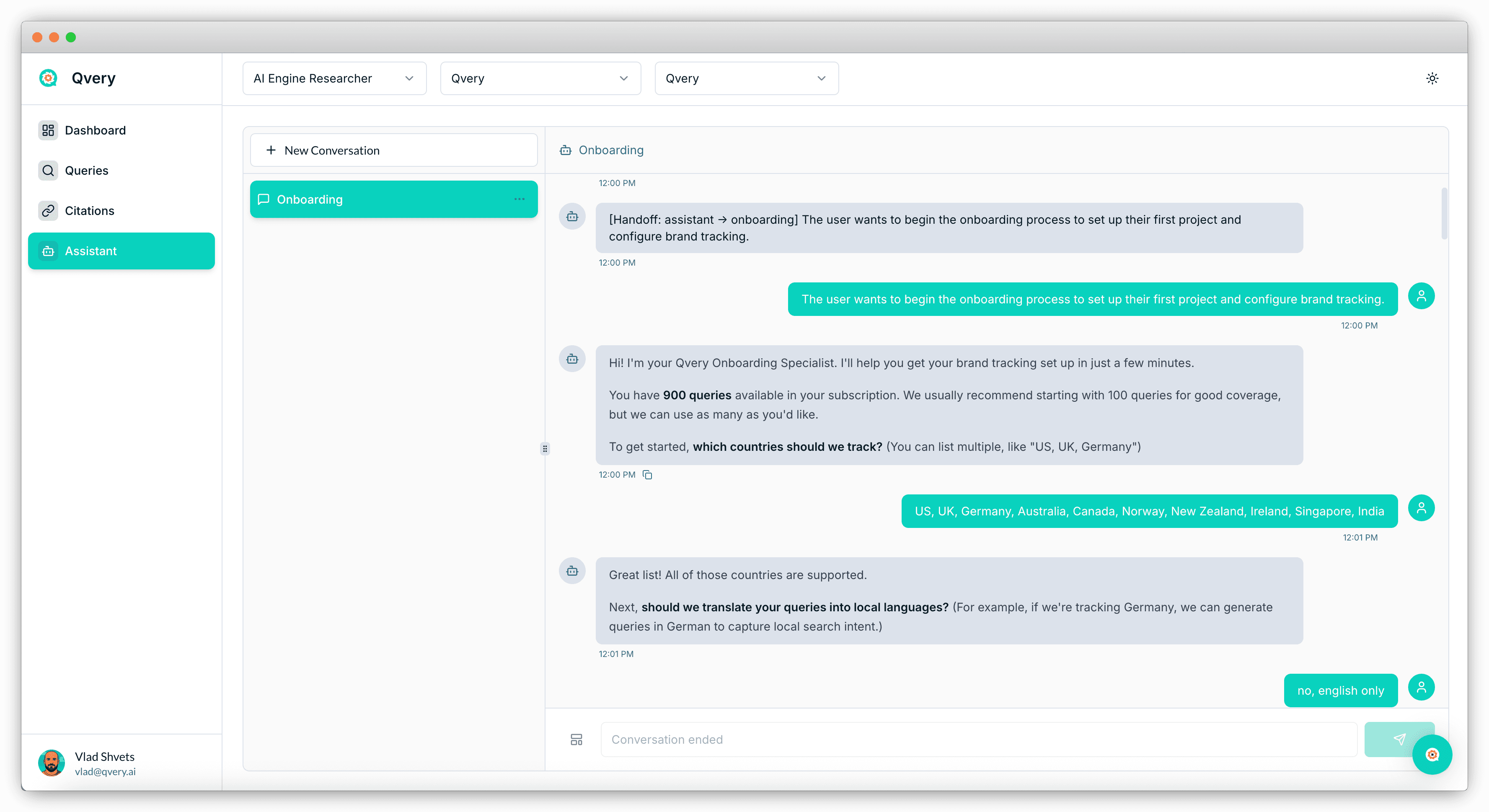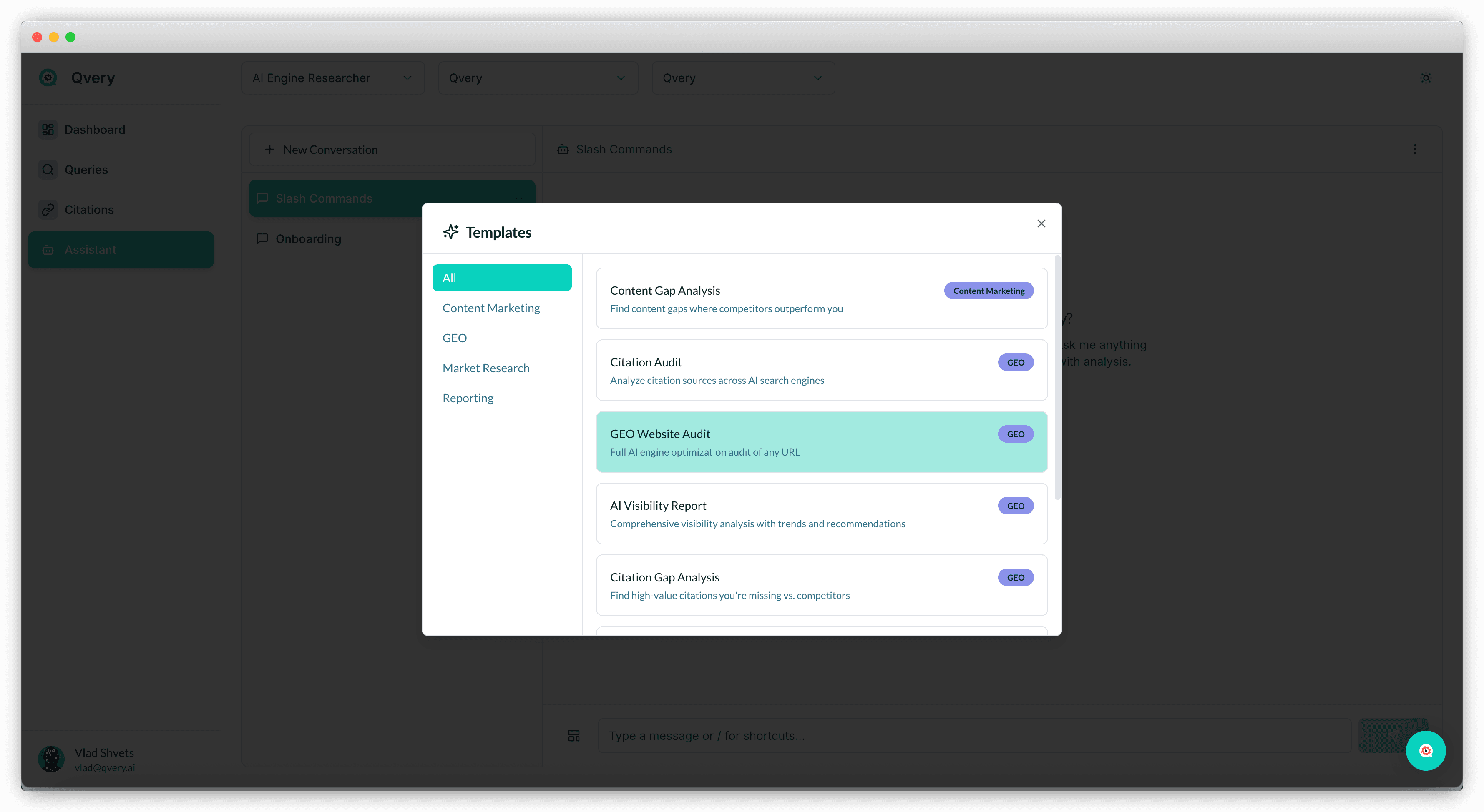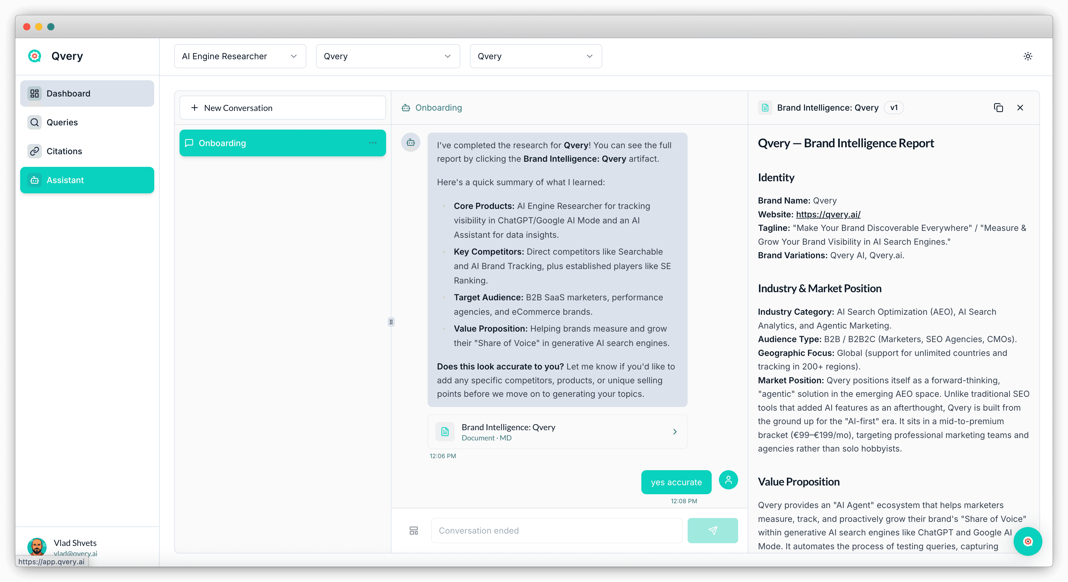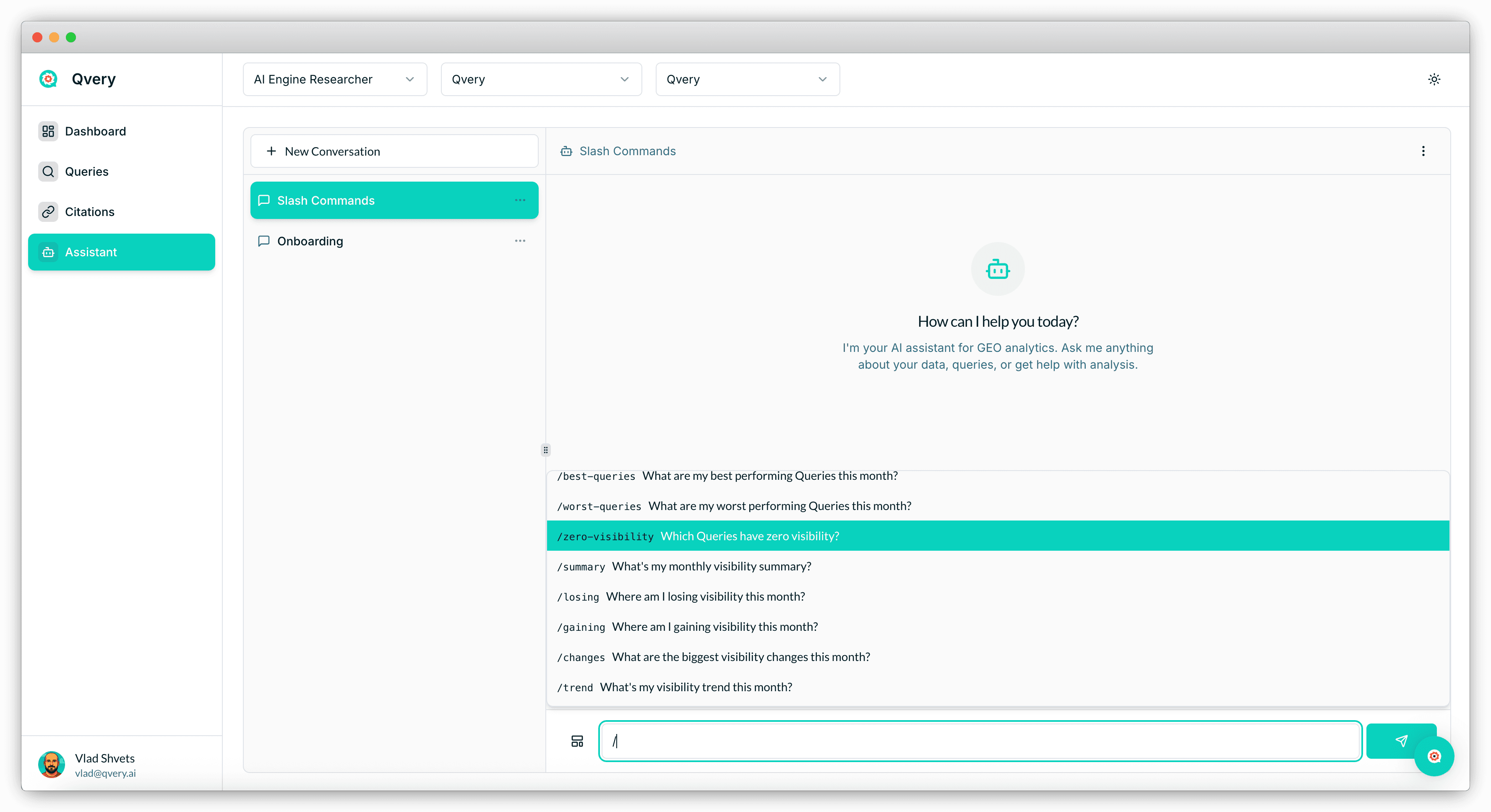 Qvery Assistant is your command center. It's a conversational interface with full access to every piece of data in your account: visibility scores, share of voice, topics, queries, citations, competitors, trend lines. You can ask it anything that touches that data and get an answer in plain English (or any language).