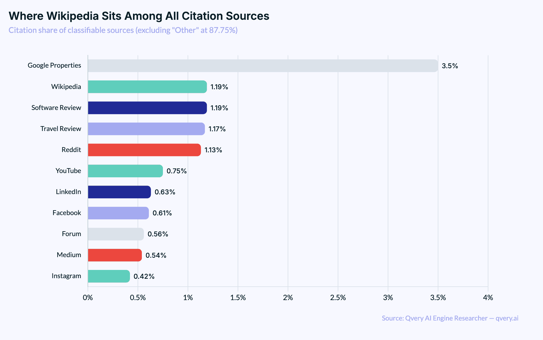 Wikipedia accounts for 1.19% of all citations across both engines (when counted by the broader Wikipedia category including all language editions). That puts it in a virtual tie with software review sites (1.19%) and just above Reddit (1.13%). But that aggregate number is misleading because of the platform split. On ChatGPT alone, Wikipedia's 2.49% share makes it the third most-cited domain behind only google.com and brand websites.