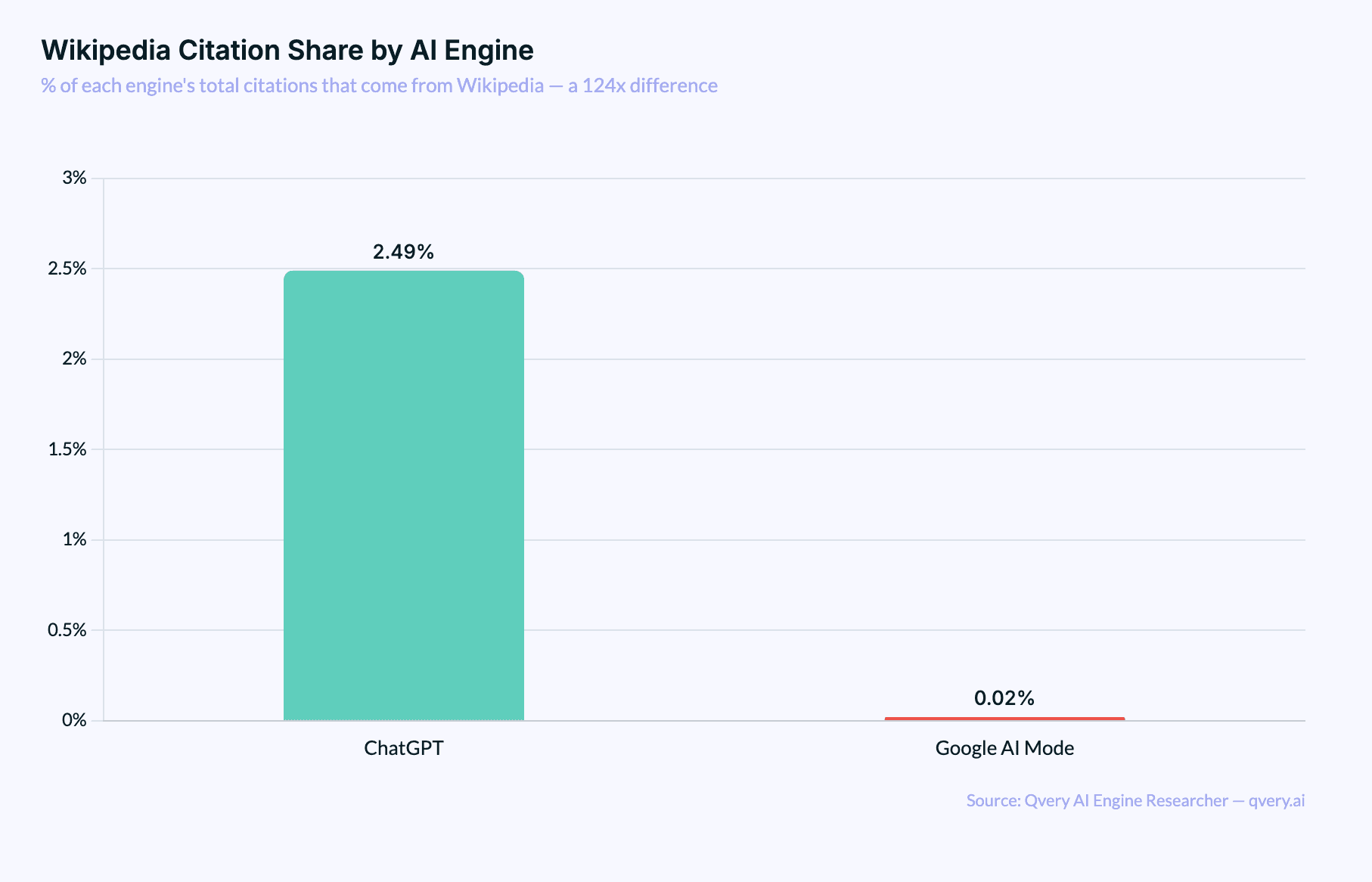 Here's the number that should reframe every conversation about Wikipedia and AI search: ChatGPT cites Wikipedia at 2.49% of all its responses. Google AI Mode cites Wikipedia at 0.02%. That's a 124x difference. The most extreme platform split of any source in our entire dataset.
