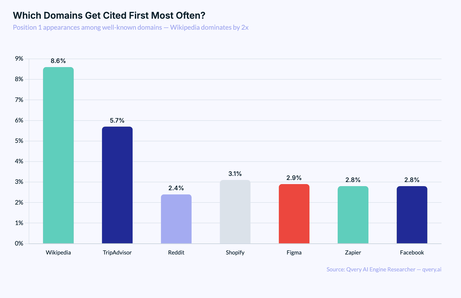 Wikipedia doesn't just get cited. It gets cited first. Among well-known domains, Wikipedia appears in position 1 more than twice as often as the second-place domain, TripAdvisor. And 99.7% of those position-1 Wikipedia citations come from ChatGPT.