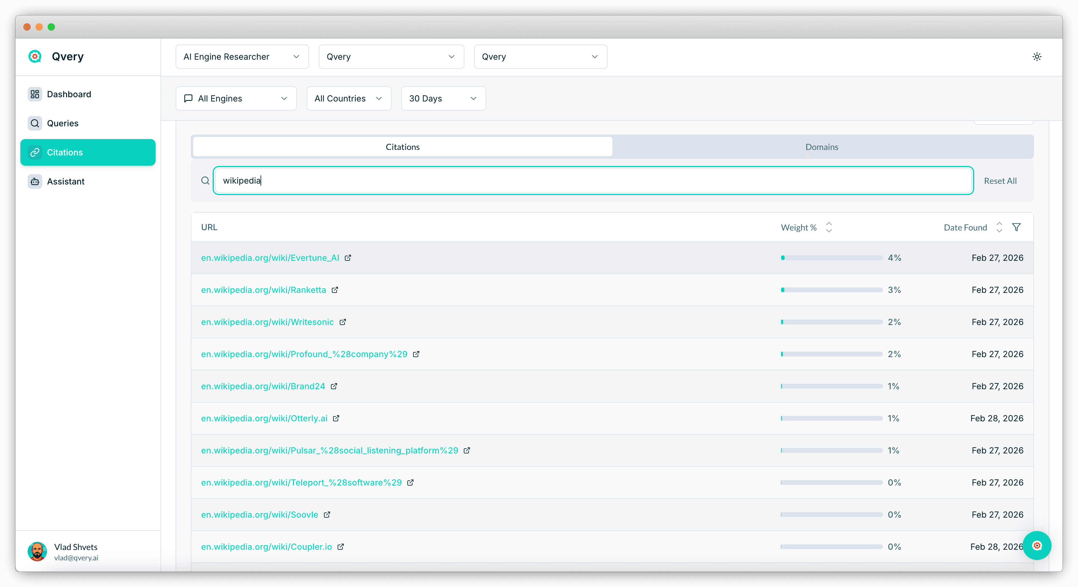 Every data point in this post comes from Qvery's AI Engine Researcher. It runs your brand's queries across ChatGPT and Google AI Mode daily, captures every citation, and tracks where each one comes from, what rank position it appears in, and how it changes over time.