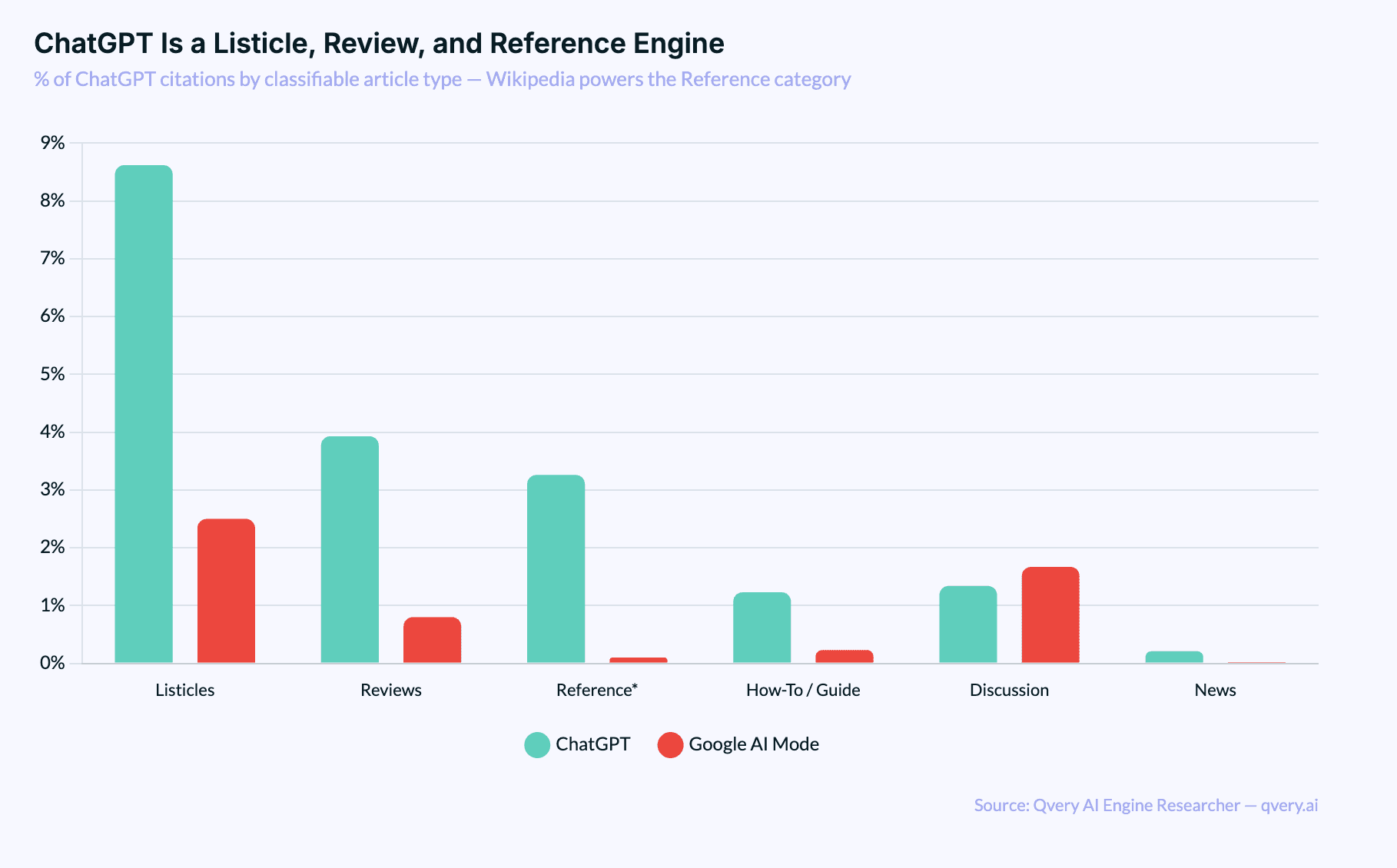 ChatGPT and Google AI Mode don't just cite different amounts. They cite fundamentally different types of sources. Wikipedia, encyclopedic references, and listicle content skew heavily toward ChatGPT. Google Properties, TripAdvisor, and social media skew toward Google AI Mode.