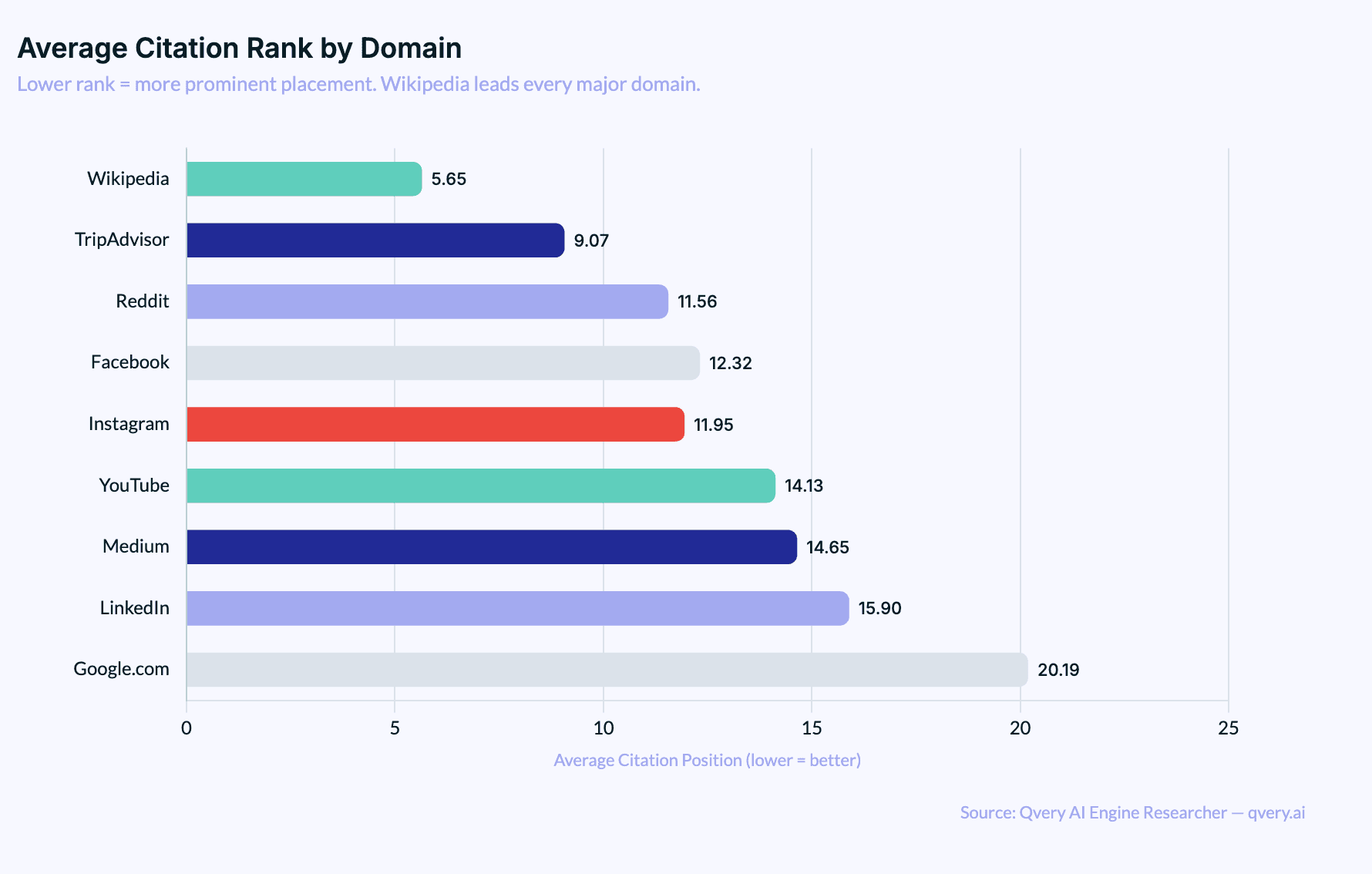 Wikipedia has the best average citation rank of any domain in AI search. Better than Reddit. Better than YouTube. Better than your carefully optimized company blog that took three years to build. The world's free encyclopedia, the website your college professor told you to never cite, is the single most prominently placed source across AI engines.