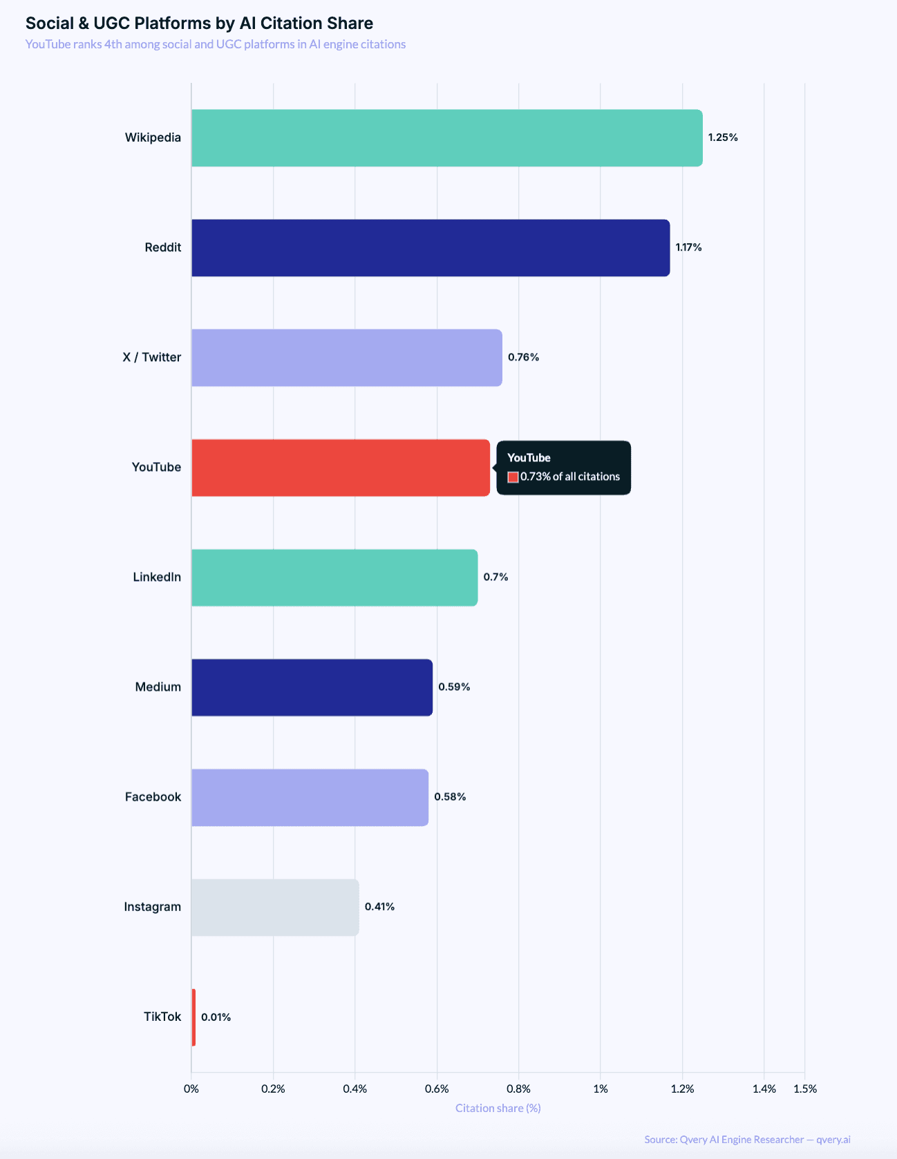 YouTube gets fewer citations than X. It gets roughly the same as LinkedIn. TikTok, with approximately one billion monthly active users, sits at 0.01%. (Apparently AI engines aren't ready for dance tutorials as source material.)