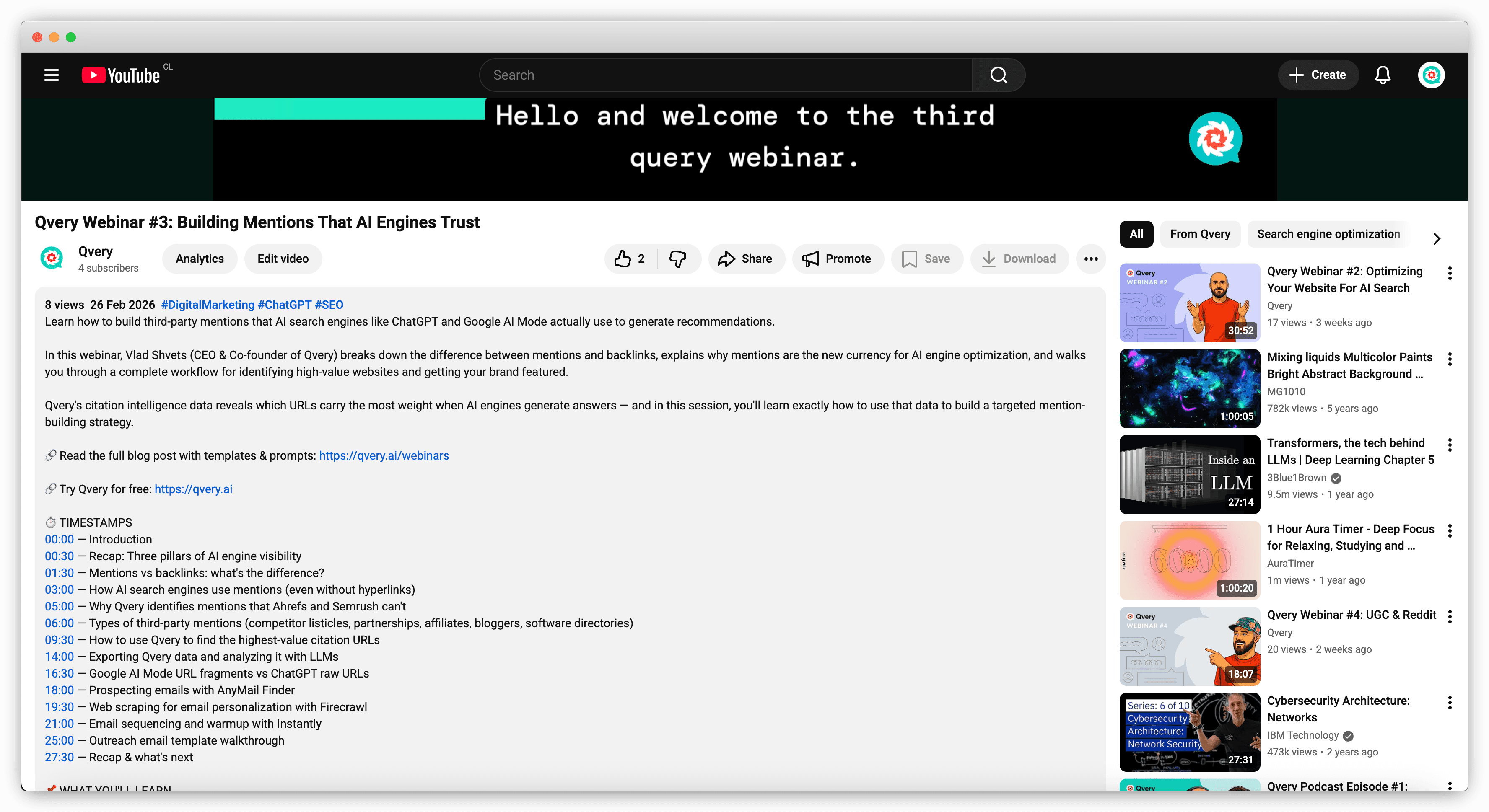 Once you have genuinely useful content, make it easy for AI engines to find the right moments. Add timestamps and chapters to every video. Google AI Mode links to specific timestamps 31.8% of the time, and those citations rank 24% higher. Break your videos into clearly labeled sections that mirror how people actually ask questions.