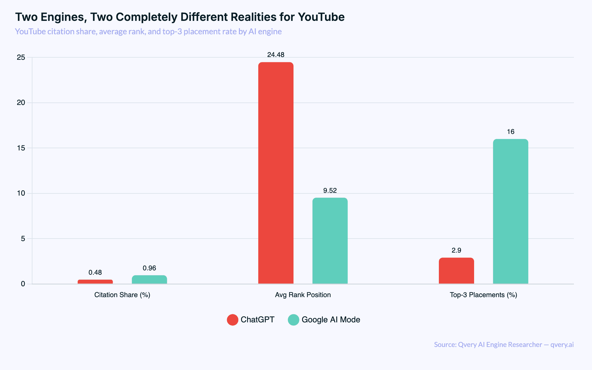 ChatGPT: 0.48% citation share. Average rank: 24.48. Top-3 appearances: 2.9% of its YouTube citations. Rank-1 appearances: 0%.