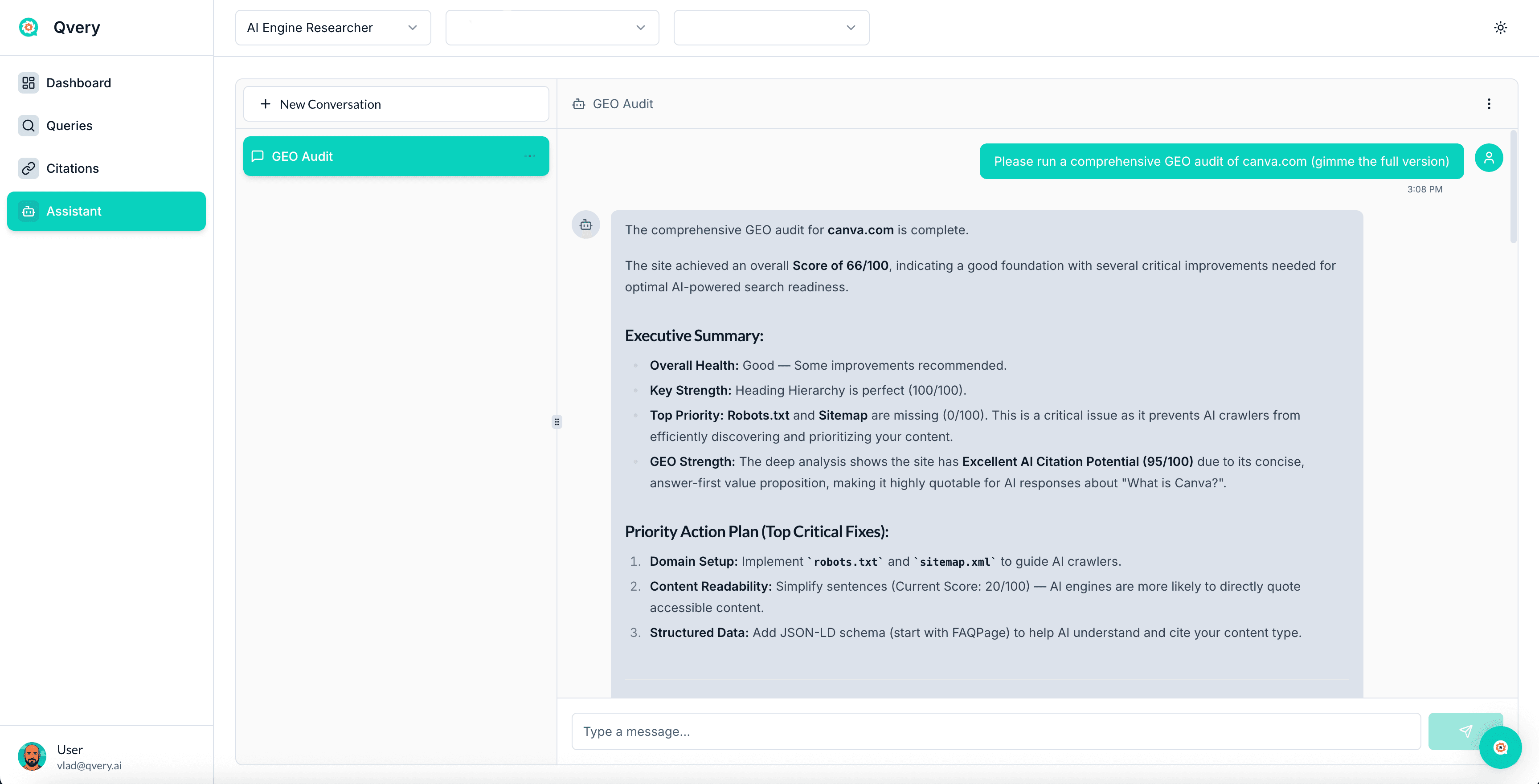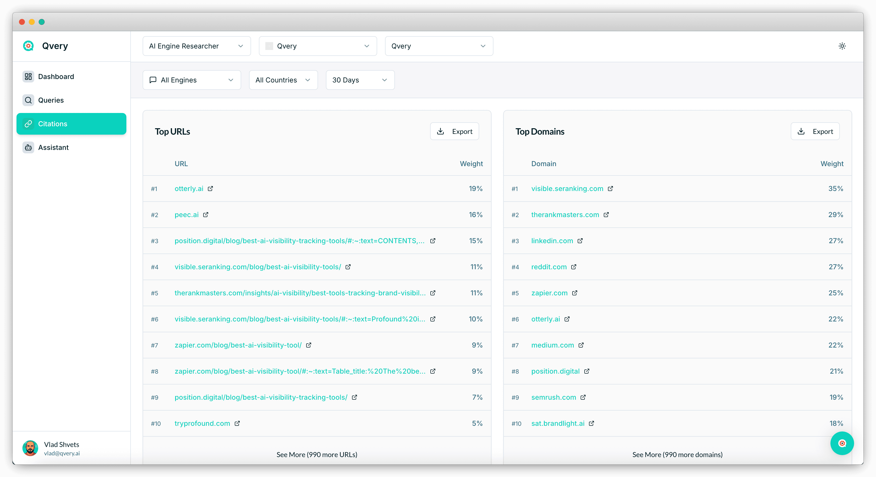 Qvery Assistant: our built-in AI chat that lets you explore citation data conversationally. Ask it "show me the top 10 listicles by citation weight where my brand isn't mentioned" and get an actionable list in seconds.